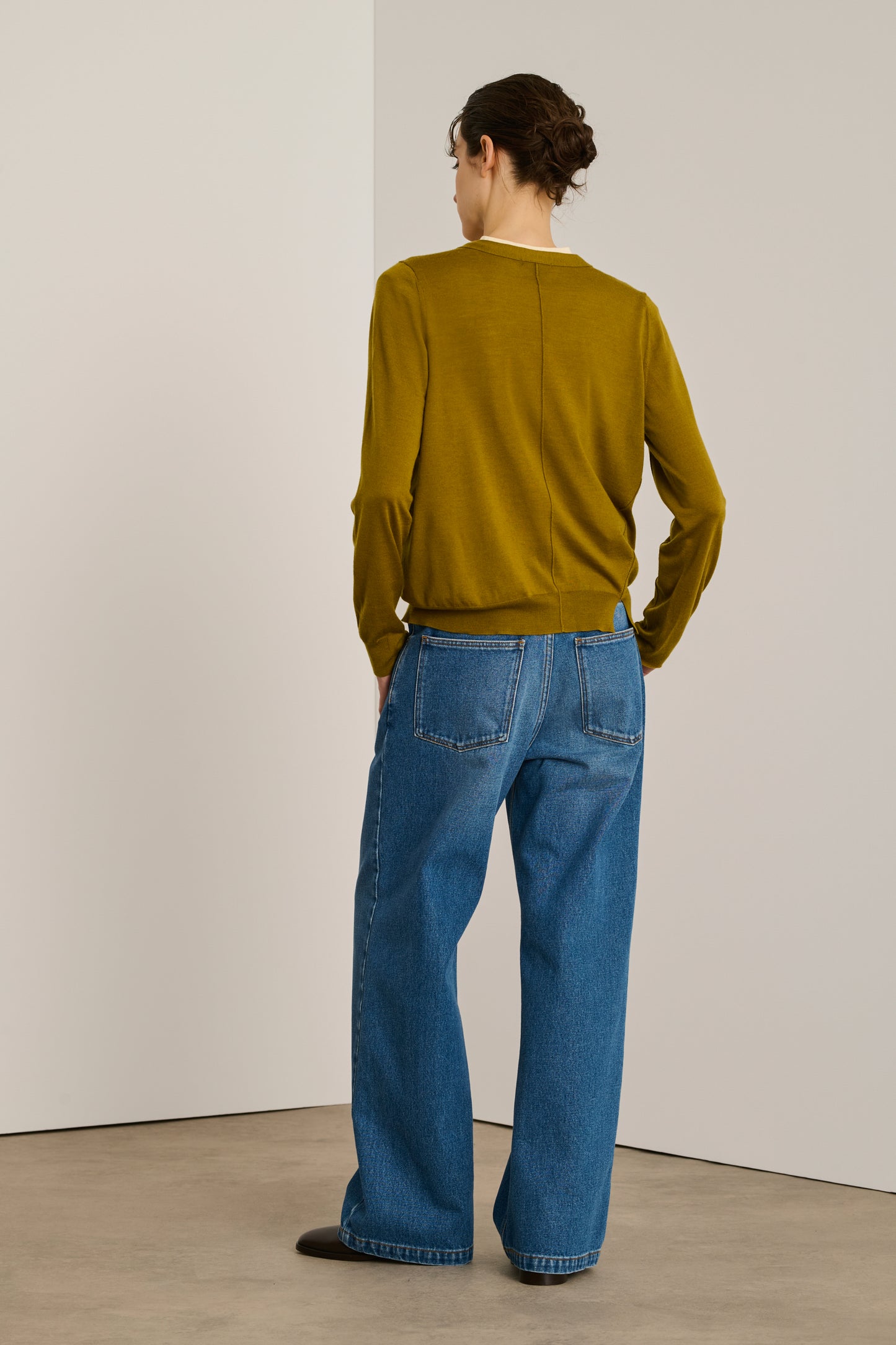 ALYSSA is a relaxed cardigan with a wide V-neckline. It is knitted in extra-fine merino wool to be worn directly on the skin. Asymmetry at the hem, decreases, ribbed trims and inside-out seams are details that add charm to this deceptively classic cardigan.