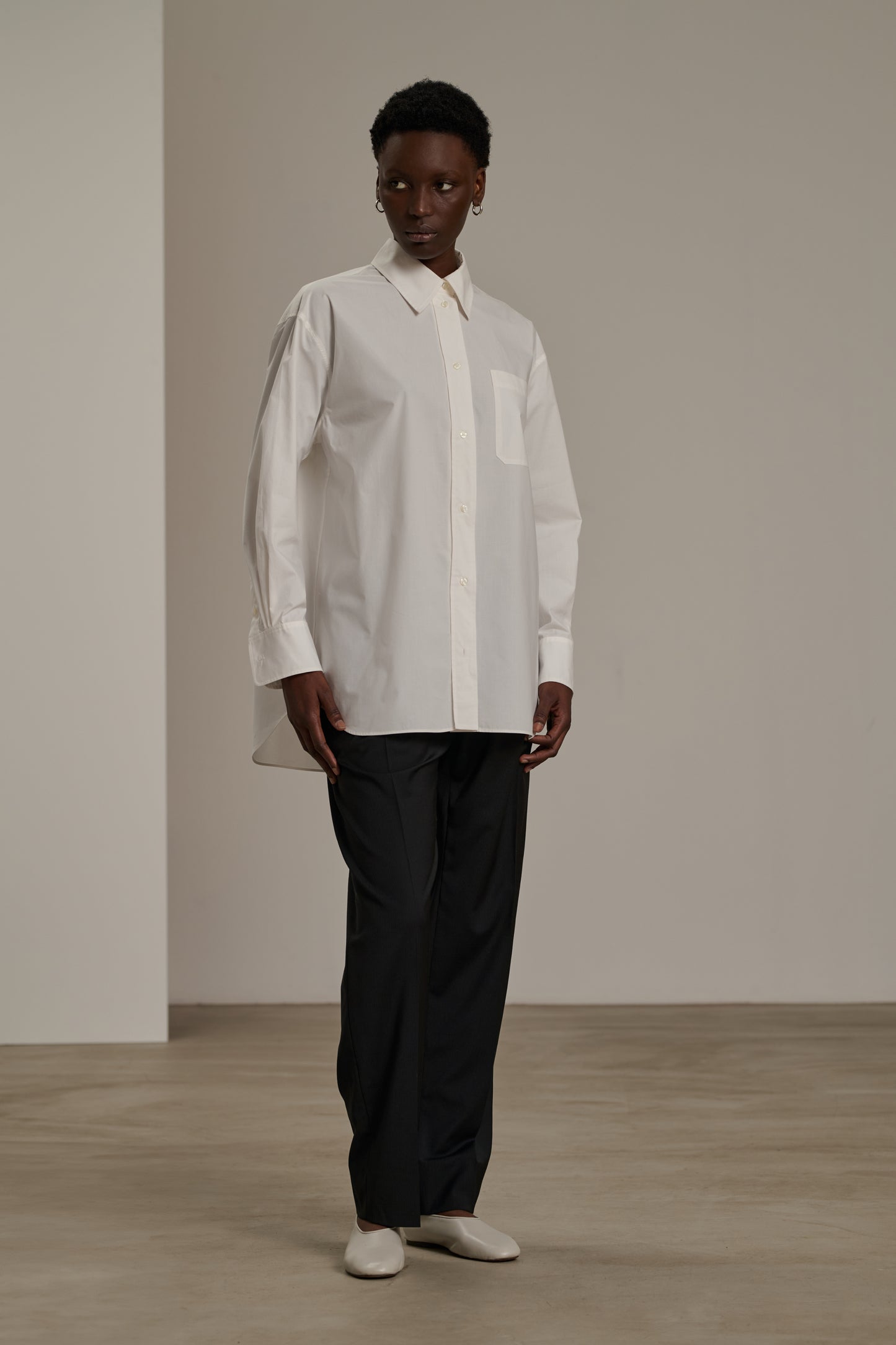 CARLOTTA is an off-white poplin shirt featuring an oversized fit inspired by men's wardrobes, offering a casual yet elegant style.