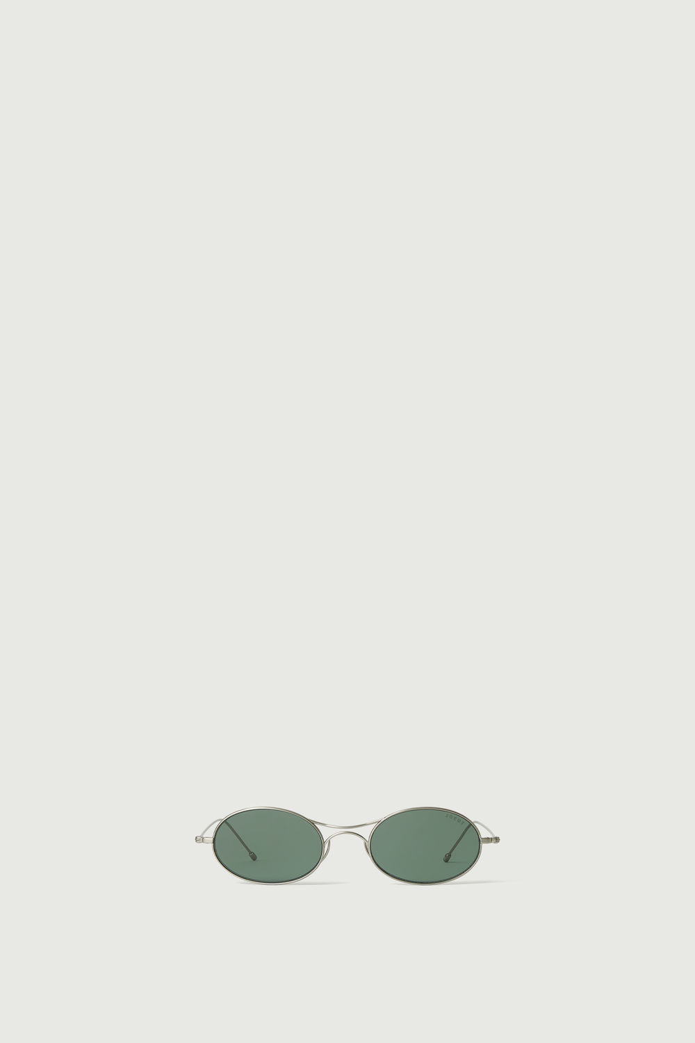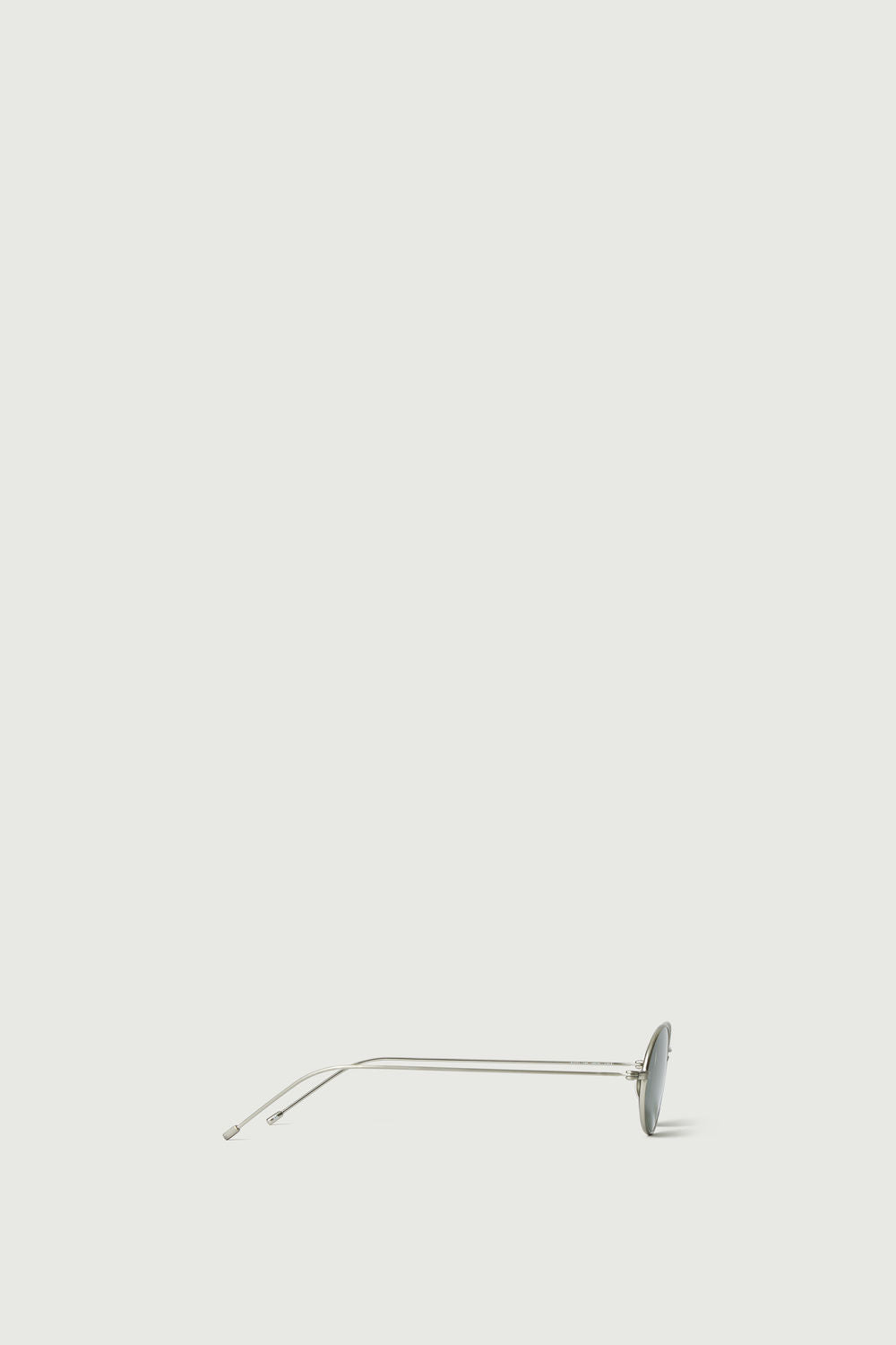 AMBER is a pair of metal sunglasses with an oval silhouette inspired by the 2000s. Its slim, minimalist frame frames dark-tinted lenses for a graphic, bold look.